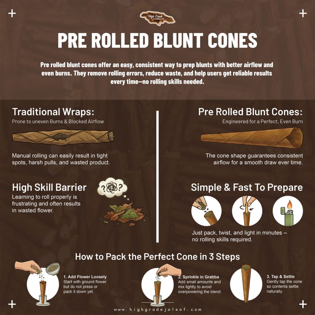 Pre rolled blunt cones deliver more consistent burns than traditional wraps, especially when using Grabba.
