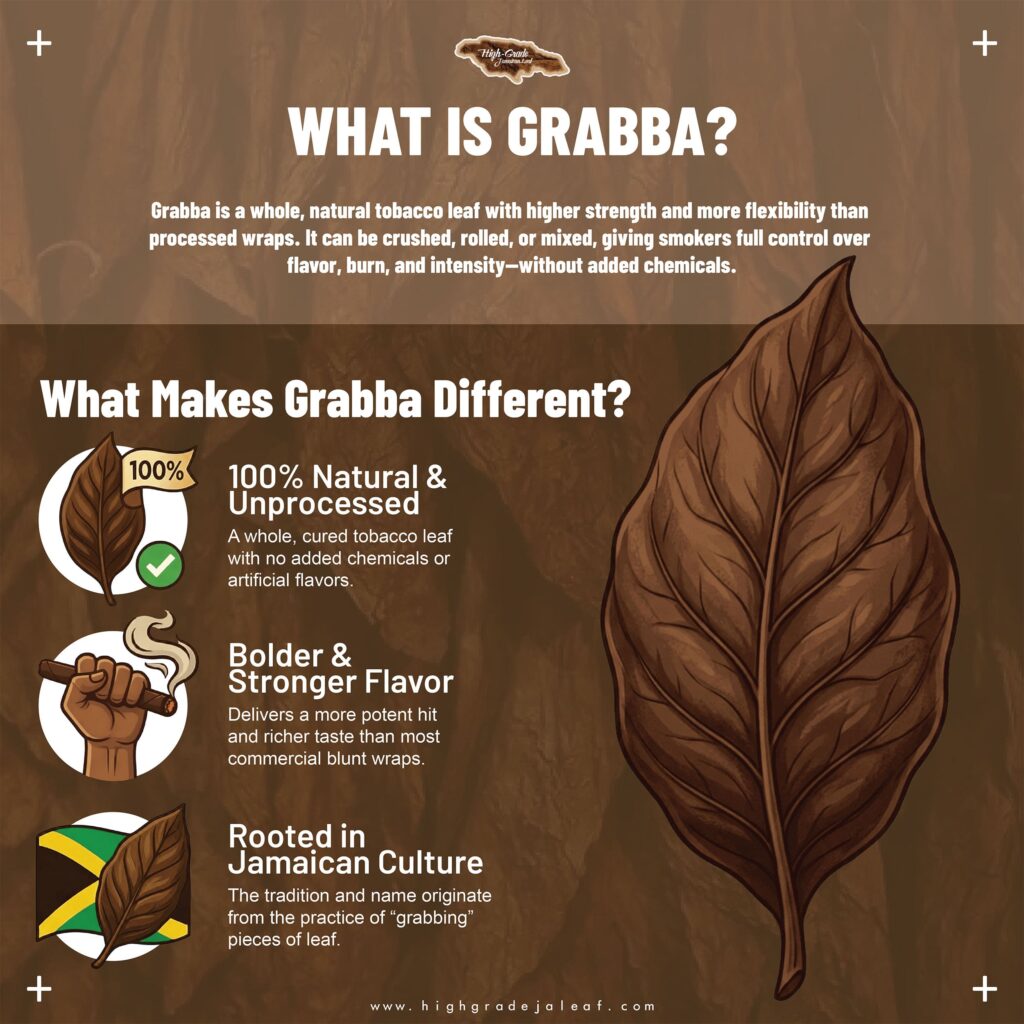 Grabba is a dark, whole tobacco leaf used for smoking, known for strong flavor and nicotine.