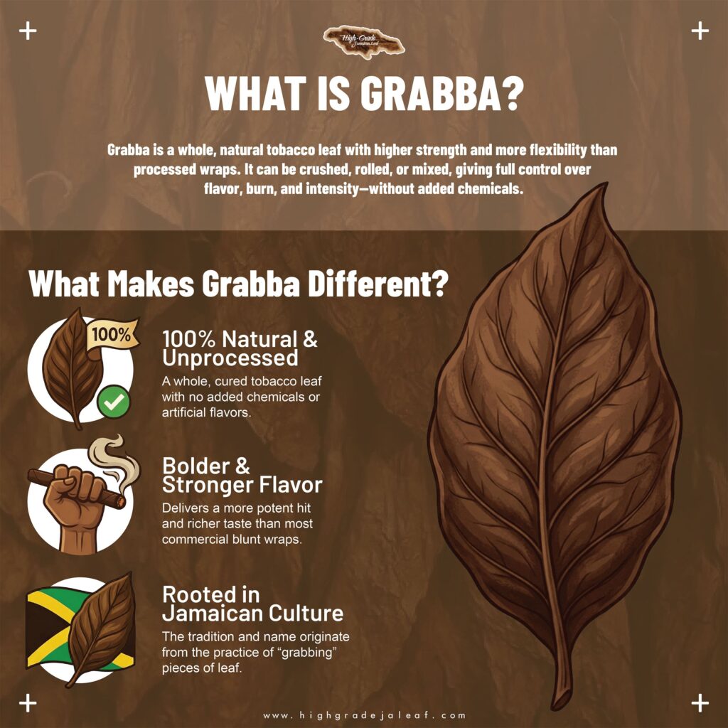 Grabba’s origins trace back to Jamaica, where dark, air-cured tobacco leaves have been used for generations. These leaves were traditionally cured slowly, producing a strong, rich profile suited for blending.